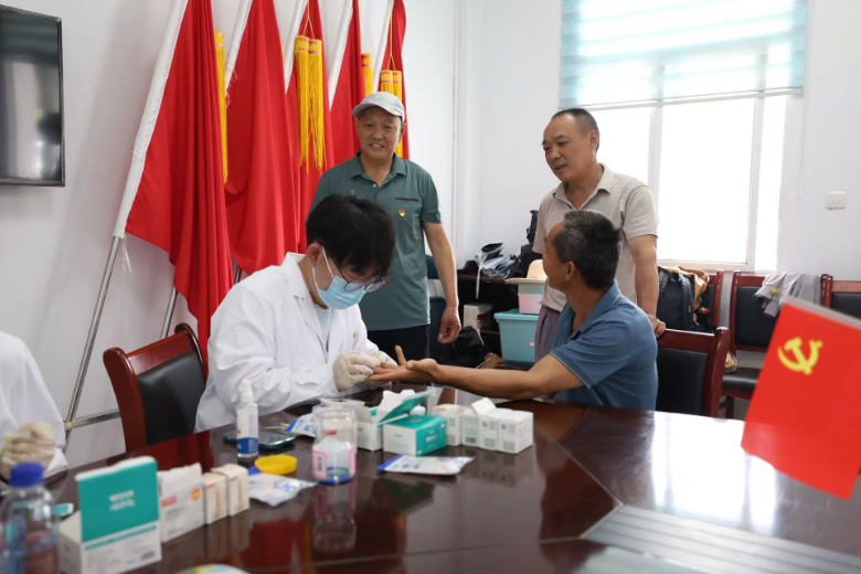 7月1日,實踐團赴安徽紅色區域中心紀念館學習革命歷史,領悟紅醫精神內涵。隨后在古橋畈村、落兒嶺村黨群服務中心為老黨員開展“赤心融皖醫路行”義診,提供血壓測量、健康咨詢等服務,將“治未病”理念與現代健康管理結合。老黨員分享奮斗故事,團隊成員在實踐中深化“以醫學服務群眾”的使命認知。