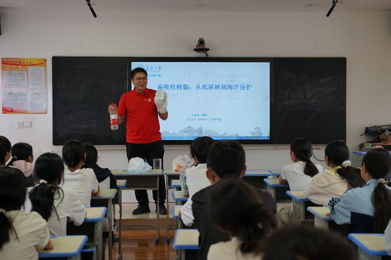 博士賴淏現(xiàn)場(chǎng)演示:一小勺白色粉末倒入水杯,瞬間膨脹凝固!“這就是紙尿褲里的‘秘密武器’,”他揭秘道,“但它更是海洋的守護(hù)者——吸油樹(shù)脂能高效‘吞噬’泄露原油,一克可吸附自重三十倍!”學(xué)生們爭(zhēng)相觸摸模型,感受科技凈化海洋的力量。