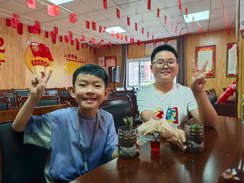 在多肉生態瓶制作現場,志愿者備齊透明塑料瓶、火山石、營養土和玉露、熊童子、桃蛋等多肉植物,向孩子們講解這小小瓶子便是一個“微型生態系統”。孩子們按步驟操作:先鋪底層砂石作過濾層,再添營養土,最后植入多肉并整理造型。指尖翻動間,一個個生機勃勃的生態瓶漸次成型,孩子們在動手過程中直觀感受著生態平衡的奇妙,也悄悄埋下了環保的種子。