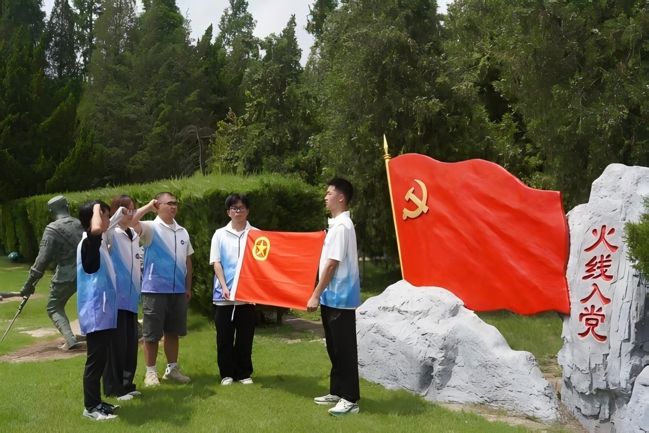 在莊嚴肅穆的八十二烈士墓前,隊員們整齊列隊,向革命先烈敬獻鮮花、鞠躬默哀。蒼松翠柏間,實踐隊員面向鮮紅的團旗,高舉右拳,重溫入團誓詞:“我志愿加入中國共產主義青年團……為共產主義事業而奮斗!”鏗鏘誓言在陵園上空回蕩,與歷史的回響交織,激蕩著每一位學子的心。
