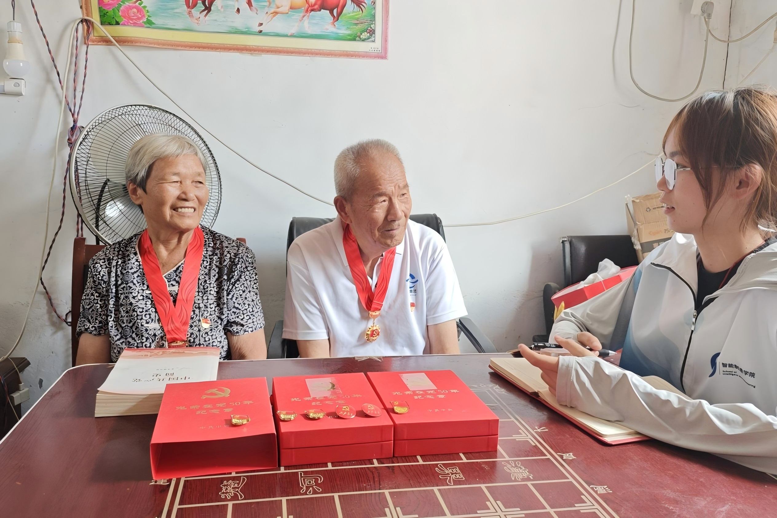 在當地老黨員家中,實踐隊員聽老黨員講述革命故事,感悟共產黨員的初心使命與責任擔當,觸摸革命溫度。82歲的張奶奶高興地為實踐隊員展示她珍藏多年的“光榮在黨50年”紀念章和優秀黨員證書等榮譽。“我這一輩子,最驕傲的就是跟著黨走。”老人樸實的話語,讓他們深刻感受到共產黨人的初心如磐。這一刻,傳承紅色基因的堅定信念植根青年心田。