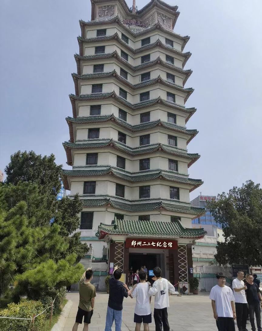 圖為隊員在了解欣賞二七塔外觀。二七塔兩棟七層,是為了紀念二月七日京漢鐵路工人運動。