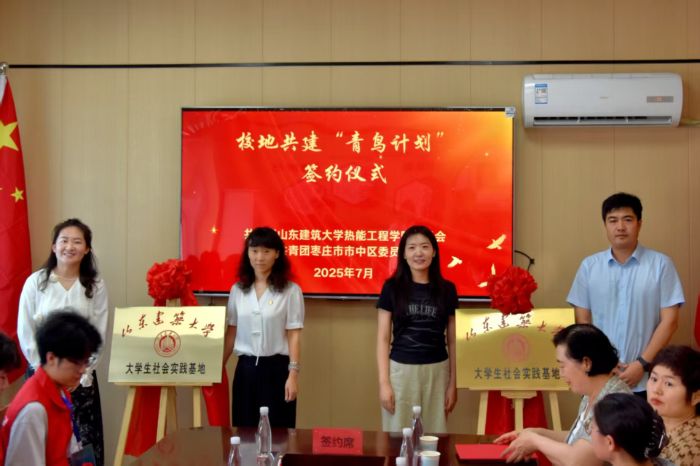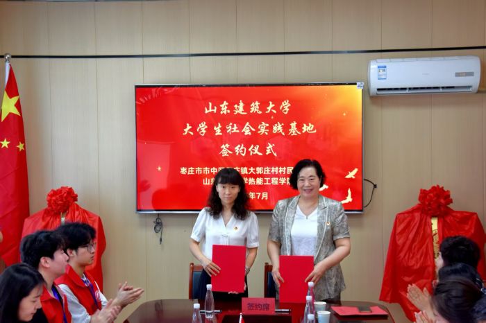 熱實踐 | 校地、校企攜手共促發展——山東建筑大學熱能工程學院與棗莊市市中區共建大學生社會實踐基地為全面貫徹習近平新時代中國特色社會主義思想,切實履行引領凝聚青年、組織動員青年、聯系服務青年的職責,引導大學生自覺走與實踐相結合的成才之路,推動社會實踐深入開展,7月11日,山東建筑大學熱能工程學院在棗莊市孟莊鎮大郭莊村舉行山東建筑大學校地、校企合作簽約揭牌儀式。棗莊市市中區團委書記高敬娜、副書記石麗,孟莊鎮黨委副書記、政協委員、聯絡室主任渠冠楠,副鎮長孫婧,社會事務管理辦公室副主任宋翠,大郭莊村書記紀麗,山東蒂夷茗生態科技農業有限公司總經理陳菲,山東建筑大學熱能工程學院黨委副書記蔣煒瑋、團委書記吳高璇及熱能工程學院“鄉村振興,'棗'有所成”社會實踐團隊成員參加此次簽約儀式,儀式由孫婧主持。