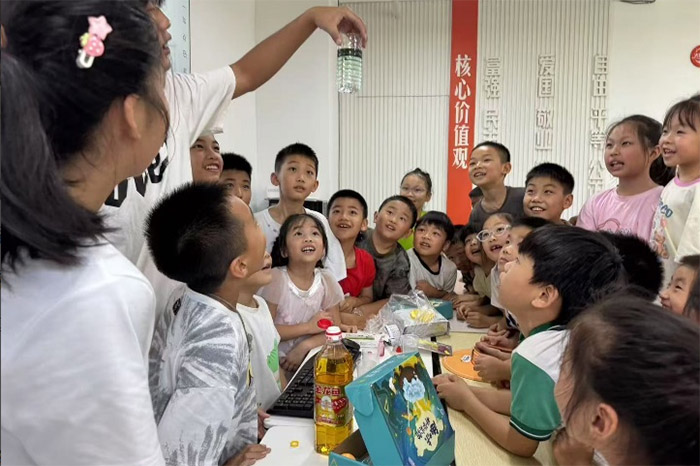 趣味科學實驗:播撒探索未知的種子 一場別開生面的科學實驗課,點燃了孩子們對科學世界的熱情。隊員們通過系列趣味實驗,將抽象的科學原理轉化為直觀體驗:將色素水裝入瓶中,演示“熱脹冷縮”原理,講解溫度計的工作機制;按密度差異依次倒入蜂蜜、水、食用油、酒精,形成色彩分層的“液體寶塔”,讓孩子們直觀理解密度概念;利用濕巾空隙讓空氣流通,制造出噴涌的“泡泡龍”……孩子們爭相參與,現場笑聲不斷。“回家也要試試!”不少孩子在驚嘆中加深了對科學的理解,探索的種子悄然種下。