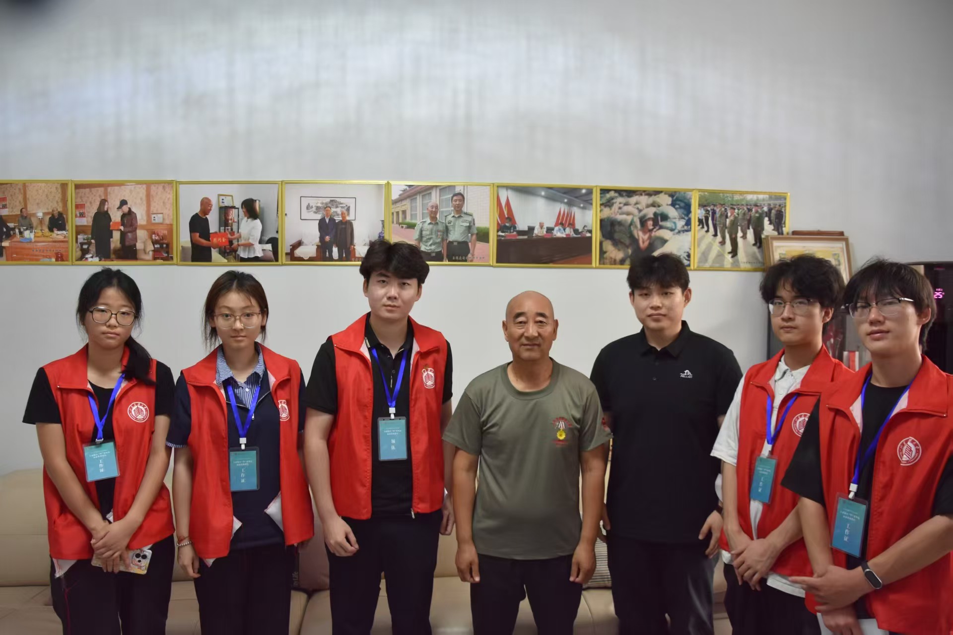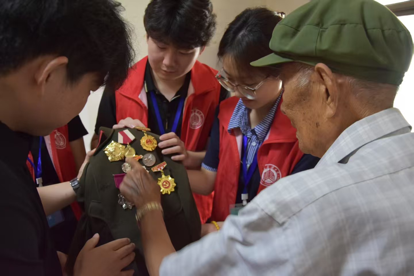 待章老情緒平復后,他繼續緩緩說道“放下戰友后,我回到了自己的陣地,從戰友的尸體下面意外翻到了兩盒罐頭,我憑著這兩盒罐頭,在高地堅守了七天七夜,殺了四十多個敵人,和我上來的戰友一死一重傷,直到最后團長向上面請示,我才最終被其他戰友保了下來”。章老講述完他驚心動魄的抗戰故事后,為團隊成員展示了他的一等功勛章以及其他的獎章。聽完章老的故事,團隊顧問劉志浩頗有感觸地對章老說到“都說現在是和平中國,可現在的和平都是章老您和您的戰友用血肉之軀為我們后代筑起來的,能有如今的和平中國,真的非常感謝您”。之后,章老還為團隊成員透露自己退伍后也一直投身在愛國主義教育的道路上,每年都會去學校為新生代講述紅色故事,宣傳紅色精神。