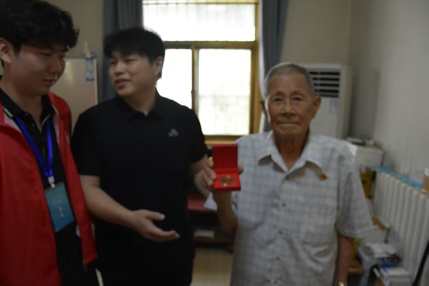 隨后經武老的孫女了解到,今天恰逢武老的96大壽,團隊成員為武老送上生日祝福并帶來了山東建筑大學紀念幣作為禮物,之后與武老合影留念,臨別時,武老特意讓青年們圍在身邊,布滿皺紋的手輕輕拍了拍最前排一個年輕人的肩膀。陽光透過窗欞落在他花白的頭發上,映得那雙飽經滄桑的眼睛格外明亮。他微微傾身,聲音因激動而有些沙啞,卻字字清晰如叩擊磐石:“孩子們,記住我這句話 —— 一定要聽黨指揮,跟黨走,這是咱這輩子最該站穩的根;一定要好好學習,把本事練硬了,才能接好接力棒,讓咱的日子越過越紅火。” 說罷,他又挨個望了望在場的每個青年,目光里滿是期許,仿佛要將這份沉甸甸的囑托,通過眼神深深烙進每個人的心里。