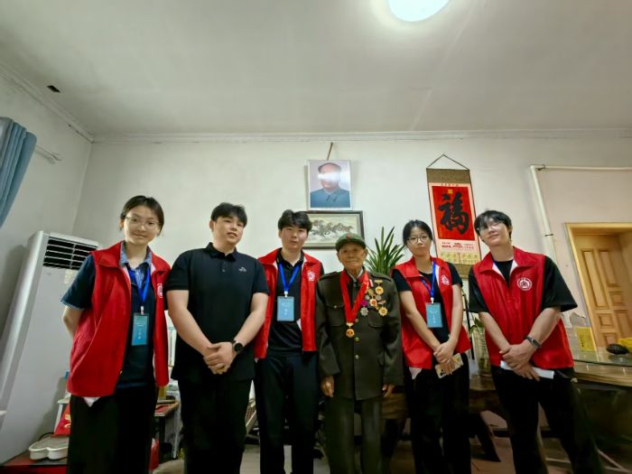 當武老談及到當年參戰時的經歷時,他神情激動,仿佛又回到了那個槍林彈雨的戰場。武老為團隊成員細細述說了他參軍時的所見所聞,生動描繪了那段波瀾壯闊的艱苦歲月,讓所有實踐團隊成員為之動容。隨后武老示意他的女兒拿出他的軍服,看到武老掛滿勛章的軍服后,團隊成員雙眼一亮,被這身帥氣的衣服所折服,紛紛上前以便更清晰地欣賞這身軍裝。隨后武老換上掛滿勛章的軍服后,為團隊成員逐一介紹了每枚勛章的由來。緊接著在團隊顧問劉志浩的提議下,武老帶領團隊成員中的黨員一起重溫入黨誓詞。當“我志愿加入中國共產黨”的誓言從大家口中鏗鏘道出時,武老眼中泛起的淚光與年輕黨員們堅毅的眼神在空氣中交匯。每一個字都像帶著千鈞之力,撞在斑駁的墻壁上又反彈回來,在不大的房間里久久回蕩。這聲音里,有武老幾十載黨齡沉淀的赤誠,也有青年黨員們初入組織的熱血,一句句誓言串聯起跨越時代的信仰,讓紅色精神在新老交替的凝視中完成了一次無聲卻厚重的傳承。