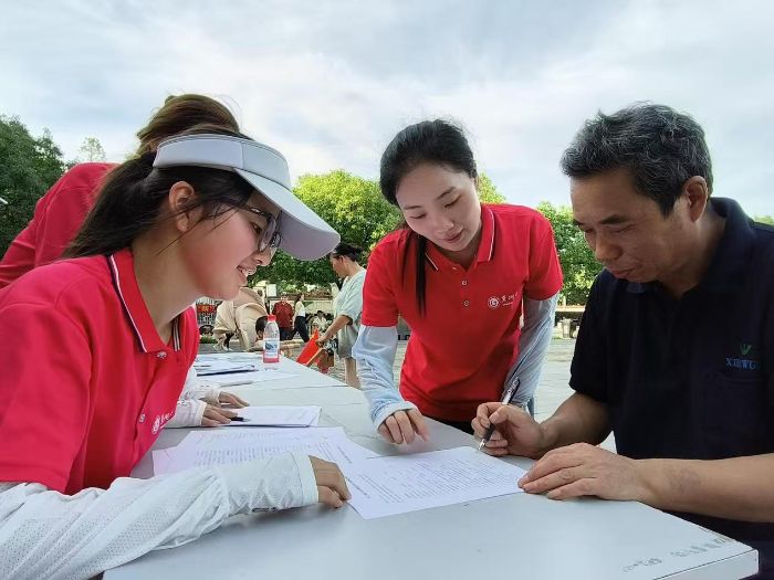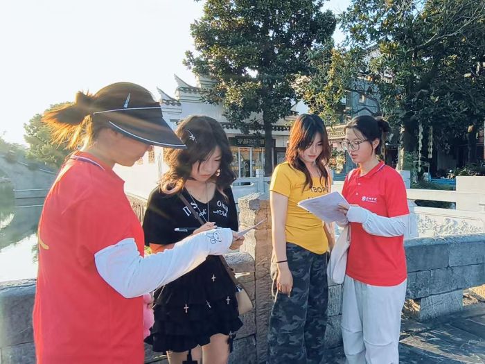 實(shí)踐團(tuán)采用“定點(diǎn)+走訪”模式,通過在古鎮(zhèn)人流密集區(qū)設(shè)立展臺,分組走訪商戶與游客等方式,重點(diǎn)圍繞公眾環(huán)保法律認(rèn)知、古鎮(zhèn)生態(tài)現(xiàn)狀和相關(guān)政策落實(shí)情況、以及改進(jìn)意見和建議等內(nèi)容進(jìn)行問卷調(diào)研。活動中,團(tuán)隊(duì)成員耐心引導(dǎo)群眾填寫問卷,主動詢問他們在日常生活中遇到的環(huán)境問題,為后續(xù)普法和撰寫調(diào)研報告積累一手?jǐn)?shù)據(jù),助力將“民意溫度”轉(zhuǎn)化為“政策力度”。