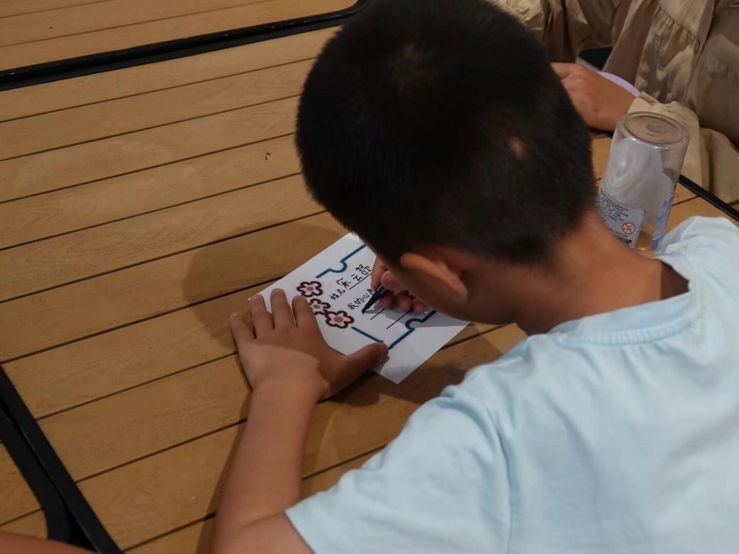 活動接近尾聲時,進入姓名牌制作環節。實踐隊為每位同學分發了白紙、彩筆等工具,指導大家動手制作專屬姓名牌。同學們興致勃勃地投入其中,有的認真在卡紙上寫下自己的名字,一筆一劃盡顯專注;有的用彩筆在姓名牌邊緣畫上花邊、小動物等裝飾,讓其更具個性。這些姓名牌能讓團隊成員和其他小朋友在之后的活動中快速叫出大家的名字,幫助大家更好地認識彼此,減少陌生感,為各項活動的有序開展提供便利,進一步提升活動的參與度與互動性。