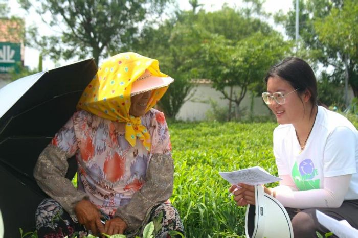 圖為實(shí)踐隊(duì)隊(duì)員向茶農(nóng)詢問(wèn)茶葉種植過(guò)程中的細(xì)節(jié),探尋茶農(nóng)生計(jì)現(xiàn)狀。王晶 供圖