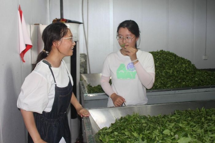 圖為實(shí)踐隊(duì)員在春雨茶廠負(fù)責(zé)人的介紹下學(xué)習(xí)茶葉的處理工序。王晶 供圖
