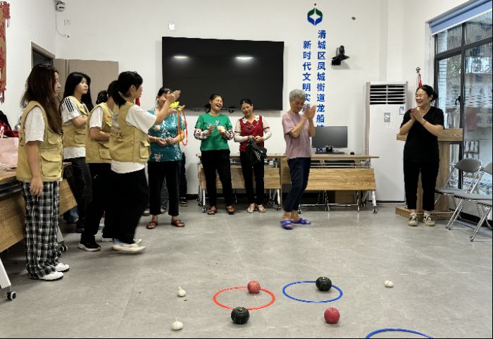圖為藝路生花文化傳承實踐隊隊員在龍船塘社區舉辦“果蔬套圈”活動