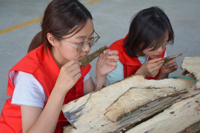 圖為筑夢團成員聞杜仲樹皮的藥香味 蔣祺 攝
