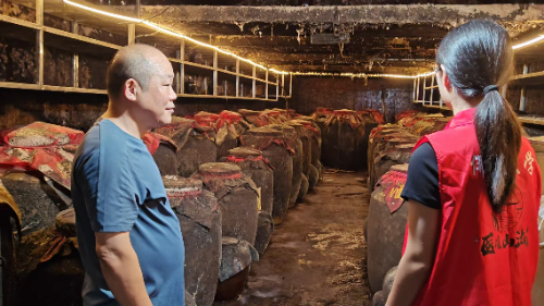 酒香文化村:傳統工藝的現代轉化與產業活力 轉戰官圩鎮沖源村(酒香文化村),實踐團被濃郁的產業氛圍所包圍。群山環抱的村落,橙黃民居整齊排列,家家戶戶門前的陶壇封存著新釀希望,墻上的“把酒話桑麻”“醉里乾坤大”等酒詩墨跡,勾勒出一幅獨特的產業文化圖景。