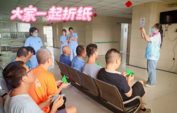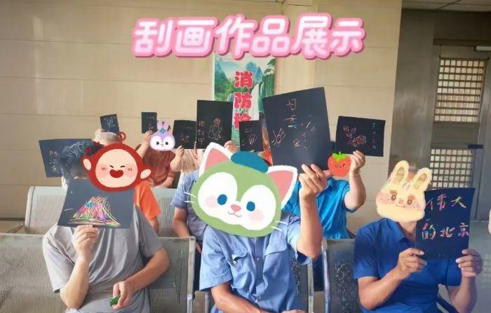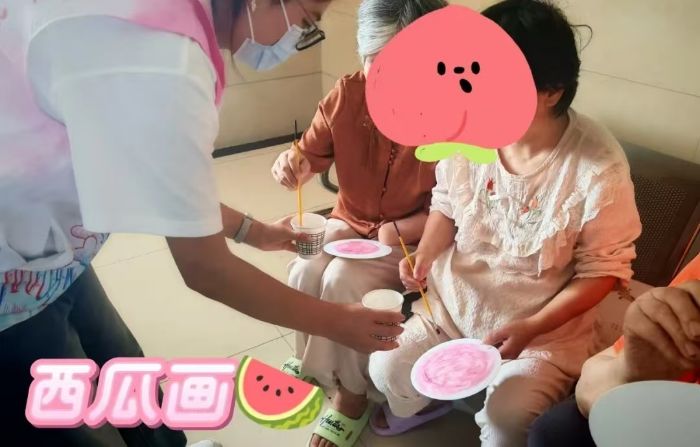 尚美怡心,志愿者帶領患者們進行各種以美育為主題的活動,帶領患者們放松身心感受藝術。志愿者們帶領患者進行刮畫、畫扇子。折紙小游戲。在刮畫活動中,參與者充分發揮想象力進行創作。其中一位爺爺,在刮畫作品中寫上了“偉大的北京”這五個字。參與者無一不為之稱贊動容,另一位奶奶,通過花開花落的創作表達了自己對生命的感悟。這時每一位參與者仿佛都是偉大的藝術家,在畫板上展現自己豐富的內心世界。無論是志愿者還是患者都被互相治愈。在畫扇子活動中,志愿者首先畫了一個西瓜范本,患者們參照模仿,但畫出的西瓜各有不同。完成西瓜作品后,參與者用自己的扇子作品扇著清涼的風,此時炎熱的夏天,在這瞬間涼爽無比,志愿者與患者共同體驗了創作的樂趣。到了折紙活動,志愿者在前方一步步教大家折愛心,在復雜的折紙中大家展現出了濃厚的興趣與學習熱情,志愿者全程提供細致指導,助力每位參與者完成作品。最后大家都順利完成了自己的愛心。每位患者都感受到了極大的滿足感。