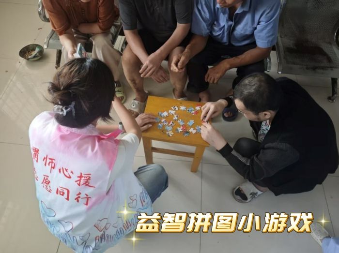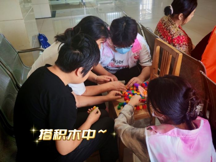 啟智明心,志愿者們和患者進行拼圖搭積木活動,在合作中患者們首腦并用,不僅提高了認知靈活性還收獲了合作益智的快樂。志愿者和患者們一起把一塊塊小的積木搭成各種各樣的小車,大家都發揮想象力,交談與合作中大家其樂融融。隨后志愿者和患者們一起進行拼圖,大家都神情專注,看著最后的拼好成果一一擺弄著手中的碎片。一次拼不好患者們又重振旗鼓,在拼的過程中大家歡聲不斷,志愿者也用相機記錄下一幕幕溫馨的時刻。最后患者們看著自己拼出的成果都獲得了極大地成就感,露出了滿意的笑容,志愿者們也都為之高興。