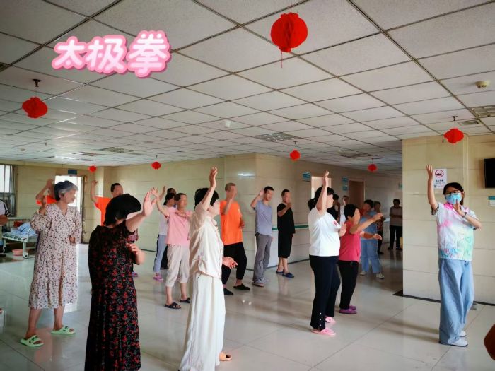 強體健心,志愿者們以體育為主題,帶領患者們進行體育運動,幫助患者活動身體,以身體健康促進心理健康恢復。志愿者們首先帶領患者們練起了太極拳,以舒緩的招式幫助大家活動身體、放松身心。“起勢、左右摟膝拗步、左右云手……”隨著志愿者的口令,患者們跟著抬手、轉身、屈膝,一招一式雖不熟練,卻格外認真。在緩慢舒展的動作中,僵硬的肢體漸漸變得靈活,緊繃的神經也悄然松弛——這不僅是筋骨的舒展,更是心靈的療愈,每一次呼吸吐納間,都藏著對身心平衡的溫柔滋養。