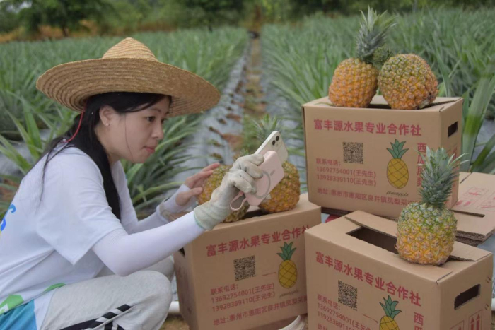 隊員在“富豐源水果專業合作社”的鳳梨包裝箱旁,通過手機直播向網友展示芒果鳳梨的色澤與質感。本次“芒果鳳梨”專場助農直播將樓角村本土的“芒果鳳梨”直接推向消費者。從合作社標準化包裝到田間真實采摘場景,鏡頭里的每一幀都在傳遞“新鮮直供”的安心感,讓香甜的“芒果鳳梨”借直播東風,走出鄉土,擴大市場。