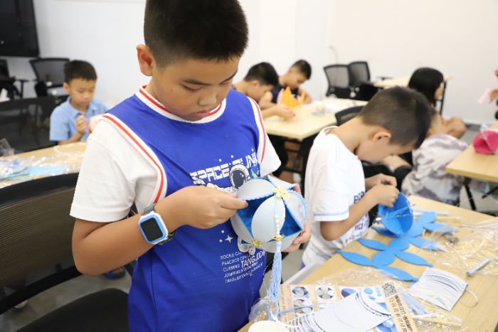 課程尾聲,隊(duì)員們組織了一場(chǎng)“繡球燈籠展”。有的燈籠上繡著簡(jiǎn)單的蓮花紋,有的用彩筆涂畫了星星月亮,還有的掛上了自己做的小紙花。“這是我和爸爸一起選的藍(lán)色布,他說(shuō)像天空一樣。”7歲的安安驕傲地介紹著。孩子們還互相講述自己燈籠的“吉祥話”,有的說(shuō)要“讓家里天天有好消息”,有的希望“像燈籠一樣亮亮堂堂”。