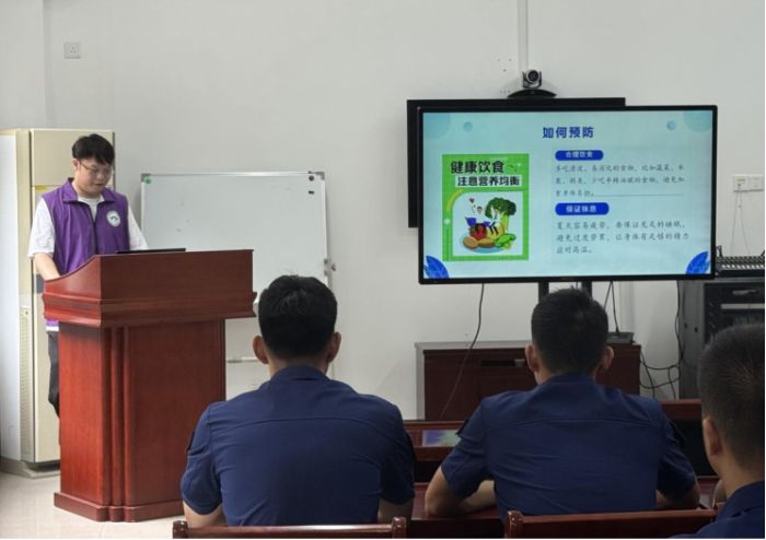 活動最后,實踐團隊成員劉阿杰為消防員講解了夏季防中暑的知識。劉同學曾經也是一名優秀的消防員,兩年的消防生涯之后又投入了醫學事業的懷抱。他結合自己以前在消防隊里的經驗從中暑的成因、常見癥狀、預防措施以及緊急處理方法等方面進行了詳細介紹,還現場演示了簡單的降溫急救操作,為消防員在高溫環境下執行任務提供了實用的健康建議。劉同學表示很高興可以用自己的所學知識幫助到曾經的戰友們,希望這次的分享可以讓他們更安全的完成日常的訓練。