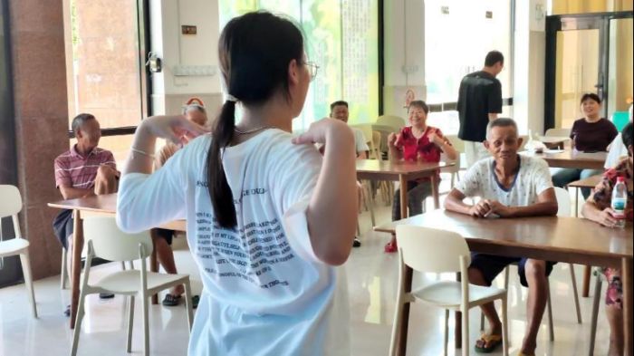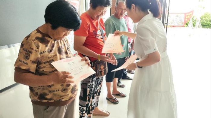 康復課堂破解勞損難題7月5日下午的村文體中心內,康復專業學子正俯身指導72歲的李阿婆練習“抗阻訓練”。針對村民長期勞作引發的肩頸問題,團隊原創設計“五步頸椎保健操”,采用閩南方言口訣配合手部牽引教學。“米字轉頭三遍慢,雙手推頭力要勻……”通俗的指導讓老人驚喜發現:“原先轉頭咔咔響,現在松快得像抹了油!”現場發放的200把“康復智慧扇”成為特殊教具——扇面正反印制操法圖解與慢性病知識,讓健康指南隨時可查。