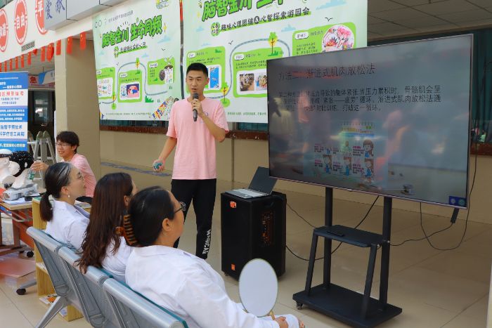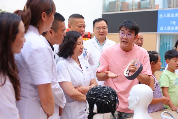 縣人民醫院大廳里,一塊醒目的“心靈驛站”標識牌懸掛就位,實踐隊通過科普展板介紹特色功能區域及腦智健康知識,同時引入虛擬現實和睡眠腦電監測等前沿技術,以科技與溫情守護民族地區心靈健康。科技展剛剛開始,VR設備前就已排起了長隊,藏族孩子們踮著腳尖望向正在演示設備的哥哥姐姐,迫不及待地想體驗這場科技游戲。實踐隊成員葉澄沅說:“把課本里的知識變成大家聽得懂的話,我們磨了好多天。”他們將復雜腦機制拆解成實用的情緒調節法、記憶小技巧,還借《周公解夢》聊起“夢是大腦在整理記憶碎片”。