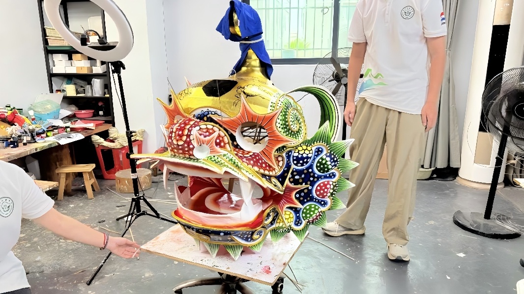 謝秋宇向隊員們介紹,制作麒麟獅頭最難的環節是扎骨架,竹篾需削得勻稱,綁扎要精準到位,差之毫厘就會影響整個作品的精氣神,這就像做人做事,根基必須打牢,后面再用心也難成氣候。每一道工序都承載著祖輩的智慧。八卦紋象征天地和諧,云紋代表吉祥如意。做手藝不只是為了謀生,更是在守護海豐人共同的文化記憶。”謝秋宇師傅表示說,現在很多年輕人覺得傳統手藝過時了。”謝秋宇這些年嘗試把現代美術技法融入傳統工藝,讓獅頭更符合年輕人的審美。”