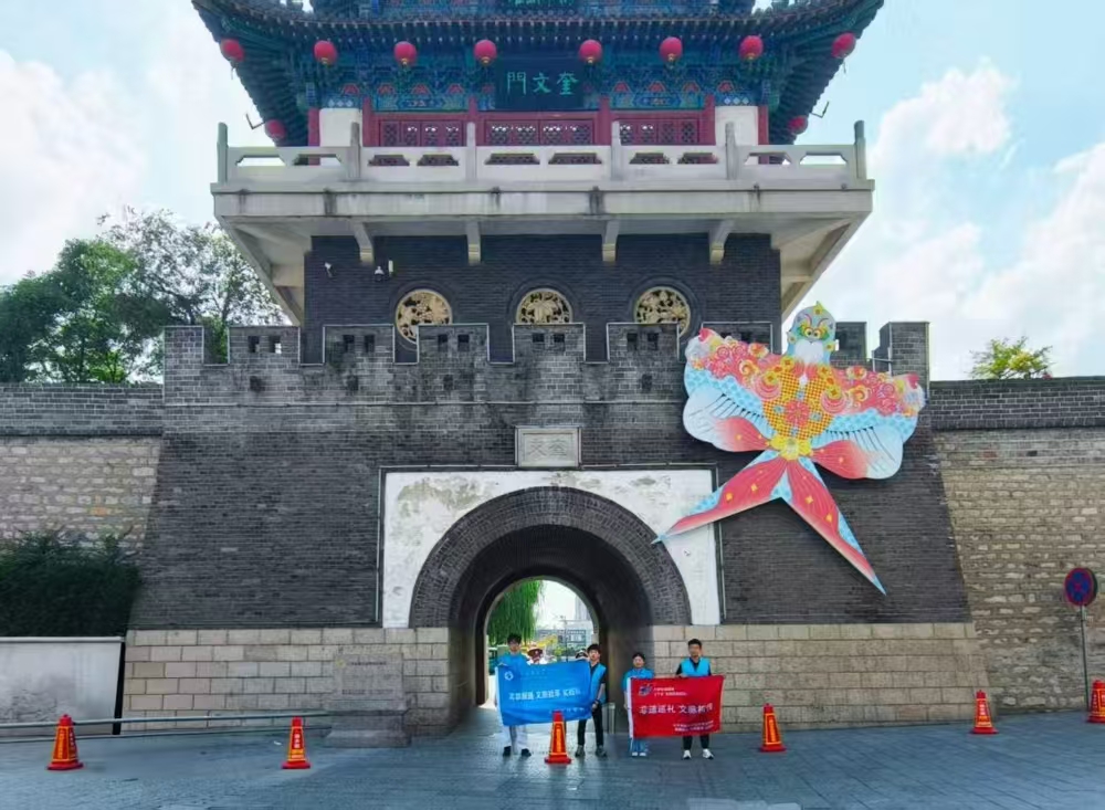 實踐團隊圍繞濰縣磚雕這一非物質文化遺產展開系統性調研,進行了實地探訪文化地標、考察文創產品創新、對話非遺傳承人等內容。首站來到奎文門,這座坐落于白浪河畔的建筑始建于明代,清代曾加固修建,1989 年重修,是老濰縣城原 “七樓” 之一,也是省級文物保護單位。據記載,奎文門上曾筑奎星閣,“奎星” 即文曲星,掌管天下詩書文章,奎文門由此得名,1994 年奎文區建區也源于此。如今,奎文門周邊已成為濰坊的文化地標,傳統與現代交融,濰縣磚雕作為當地歷史文化的重要符號在此煥發新生,讓隊員們感受到傳統技藝與城市歷史碰撞的魅力。