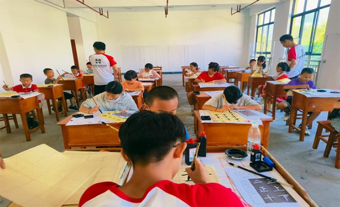 二、墨香在簡陋的教室中悠然彌漫 書法課上,大學生們執筆示范,一橫一豎,傳遞的不只是書寫技藝,更是中華文脈的千年呼吸。孩子們的小手雖顯生澀,但描摹的專注神情令人動容。孩子們手握毛筆,跟著志愿者老師一筆一劃臨摹。從橫平豎直的基本筆畫開始,感受漢字的結構之美、韻律之美。“寫字就像做人,要端端正正。”志愿者老師一邊示范,一邊耐心講解。對于很多鄉村孩子來說,接觸書法藝術的機會不多,這次暑期課堂開設書法課,就是為了讓傳統文化走進他們的生活。讓文化傳承在一筆一墨間悄然延續。