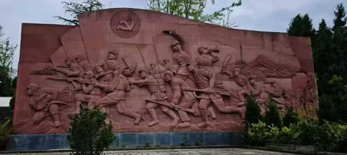 環(huán)繞紀(jì)念碑基座,是一面氣勢(shì)恢宏的紅色浮雕墻。隊(duì)員們緩步繞行,駐足凝視。浮雕以粗獷而有力的線條,生動(dòng)再現(xiàn)了那段血與火的歲月:持槍躍出戰(zhàn)壕、奮勇沖鋒的戰(zhàn)士,高舉紅旗、引領(lǐng)方向的先鋒,運(yùn)送物資、支援前線的群眾……一幅幅戰(zhàn)斗群像,將硝煙彌漫的戰(zhàn)場(chǎng)瞬間“定格”。隊(duì)員們?cè)诟〉袂傲鬟B,手指輕撫過(guò)凹凸的紋路,仿佛能觸摸到歷史的脈搏。