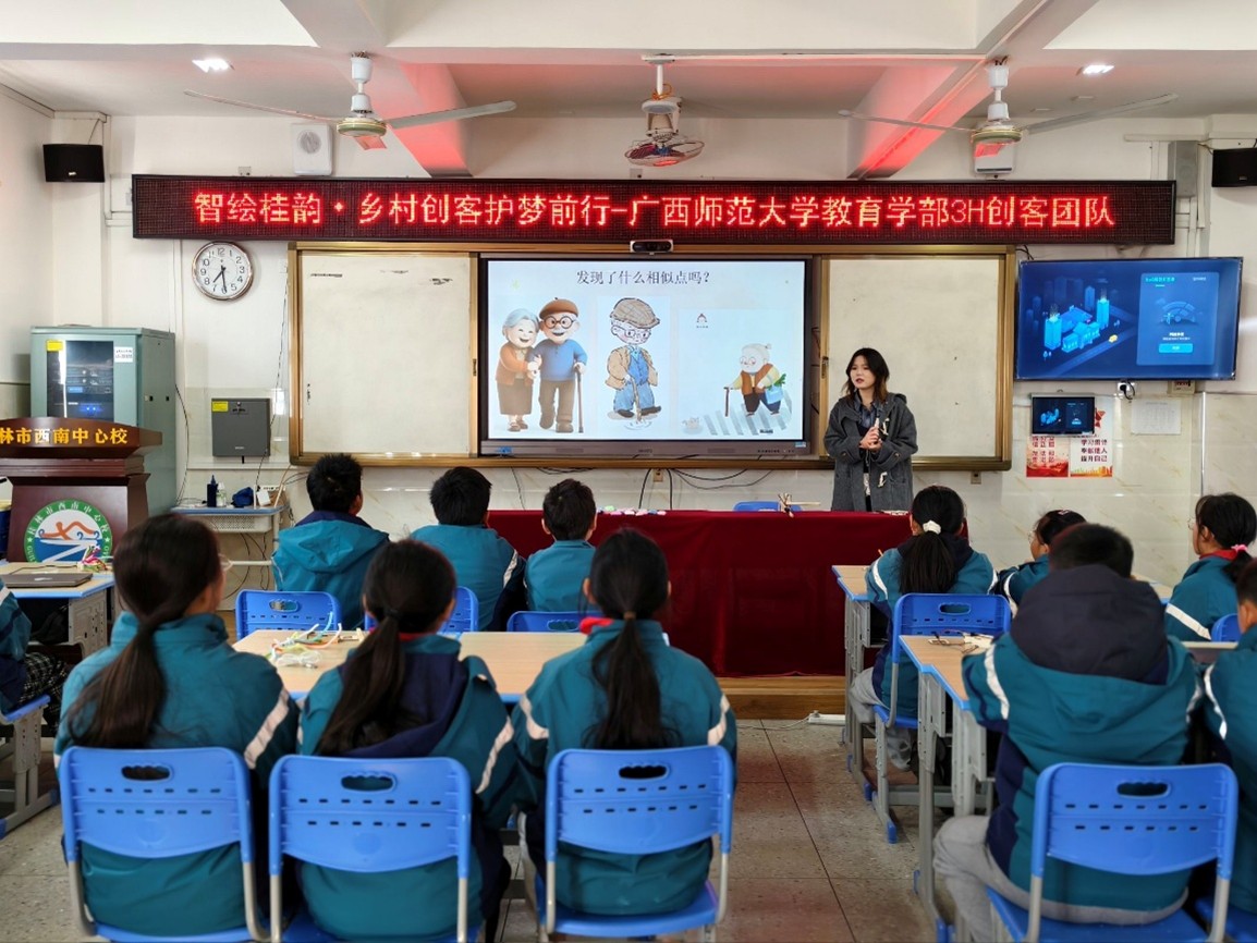 2026年寒假伊始,廣西師范大學(xué)教育學(xué)部3H創(chuàng)客團(tuán)隊(duì)奔赴桂林市龍善崇光小學(xué)、西南中心校兩所鄉(xiāng)村學(xué)校,開展“智慧守護(hù)·科創(chuàng)助老”為主題創(chuàng)客教育實(shí)踐項(xiàng)目,將“智慧養(yǎng)老”的科技種子,播撒進(jìn)了鄉(xiāng)村孩子的心田。